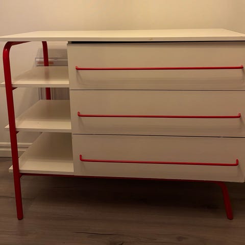 Ser ut som en byrå men har ett stort hyllplan istället och öppnas som dörr.