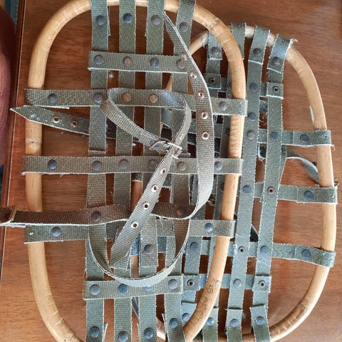 Riktigt gammal utrustning Skor med skinnsula strl 40 Ryggsäck med metallram