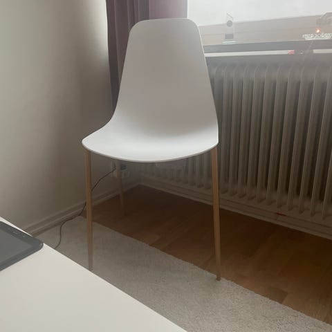 Säljer en stol ADDE från Ikea. Den har tagits isär. Kan sättas ihop igen för avhämtning, om så önskas. Du hittar måtten nedan samt på Ikeas webbplats: https://www.ikea.com/se/sv/p/adde-stol-vit-10219178/