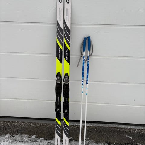 Atomic Redster, 145 cm. Lätta och smidiga stavar gjorda i 100 % kolfiber/carbon. Lite repor/skav förekommer i lacken, se sista bilden för exempel. I övrigt fint skick.
