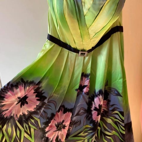 Ärmlös klänning i en ljusgrön nyans med ett dekorativt mönster nedtill. Klänningen har en smickrande passform och en diskret dragkedja i sidan.