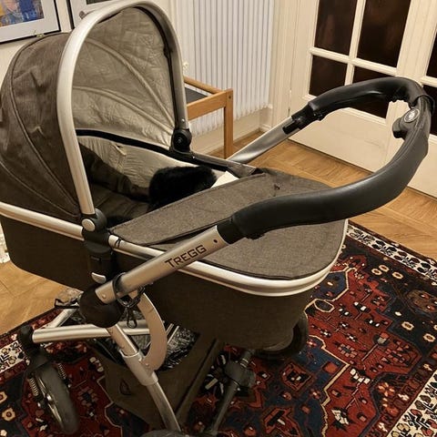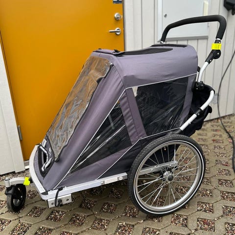 För 1–2 barn, vi har använt den till ett barn. Gott om packutrymme bakom ryggstödet. Allväderskydd med nät, regnskydd och fönster. Stora lufthjul, fjädring, fotbroms och reflexer för säker åktur. Kan fällas ihop till platt paket.