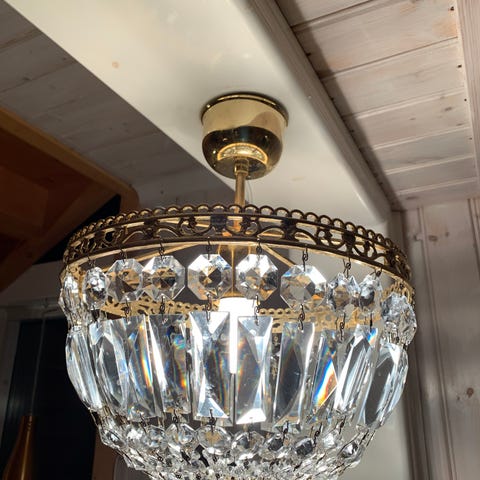 Mässingstomme och äkta kristallprismor av wachteltyp m fl. Diameter 40 cm, höjd 90 cm inklusive kedja. Tre lamphållare E14, glödlampor ingår inte. Rengjord och klar för upphängning