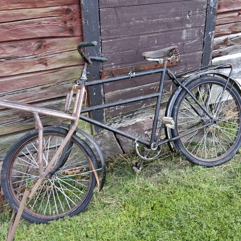 Äldre trehjuling. Ej cyklad på sen 60 talet, men använd som blombord bla.