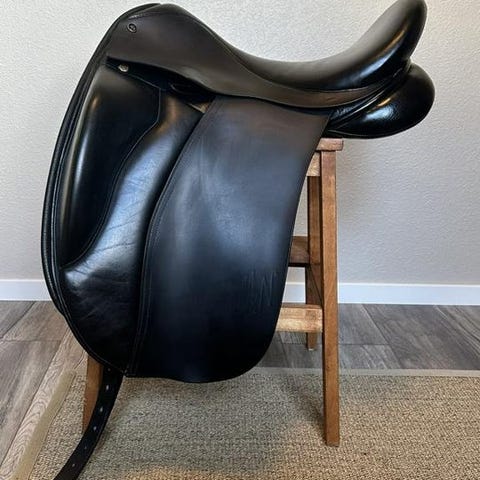 Svart dubbelkåpad dressyrsadel från Bates, modell Innova Cair 17" med svart koppjärn. Använd i 3 månader och i nyskick. Genomgången av Sadelprovare utan anmärkning. Justerbar med bl a inlägg och koppjärn. Sadelväska medföljer om intresse finns.