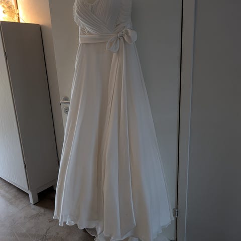 Brudklänning använd vid ett tillfälle. Storlek 10 (jag hade normal M i vanliga kläder) Vacker och bekväm klänning.