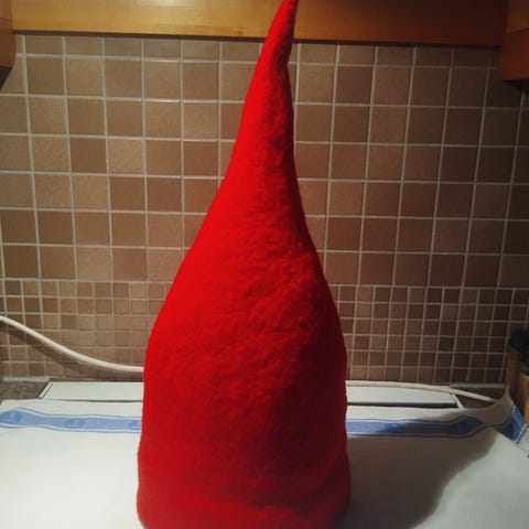2 st superfina tomteluvor i paljetter med fuskpäls. En röd och en guld. Längd 42 cm exklusive bollen på toppen. Omkrets 54 cm. Kan hämtas på Fridhemsgatan vid Fridhemsplan.