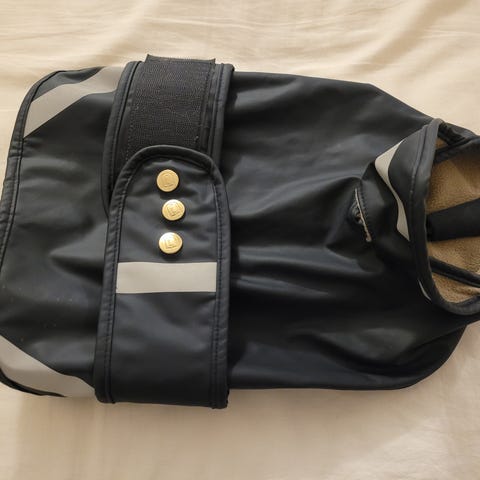 Svart: Hurrta regntäcke till hund i storlek 80 (bröstomfång). Obetydligt använd, dragsko i nacke och baktill samt en remsa man knäpper under magen. Använd till dog de bourdeux på 63 kg. 200 kr