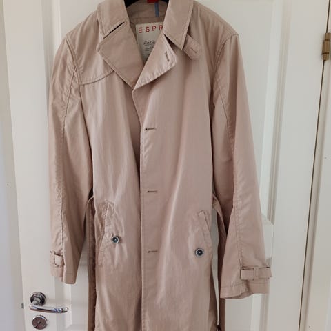 Beige trenchcoat för herr i storlek 48. Lång modell med dubbelknäppning framtill och krage. Jackan har knappar och knappslå, samt detaljer som axelklaffar och fickor i sidorna. Passar som ytterplagg under vår och höst eller mildare vinterdagar.