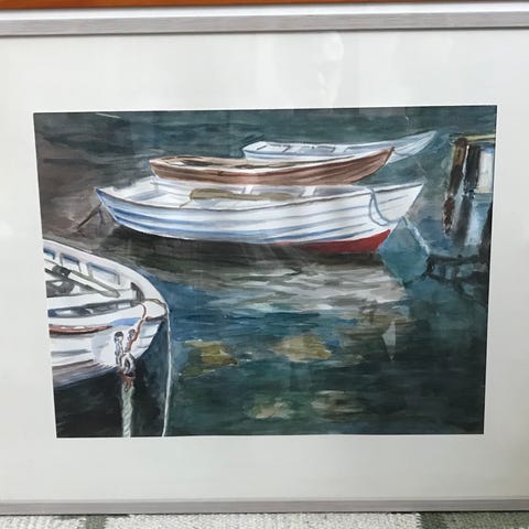 Thelma Jacobsson, Båt vid stenar, färglitografi 162 av 225. Bildstorlek ca 44 x 30. 500:-. Skickas ej, kan hämtas i Helsingborg. (Galleripris 2000 var 1.200:-)