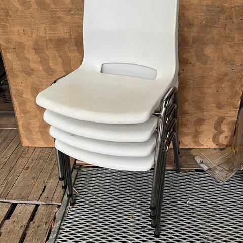 Stapelbara stolar med svart klädsel och vit ram. Stolarna har en enkel design med metallben och är lämpliga för olika miljöer där platsbesparing är önskvärd. Passar även kring ett matbord såklart.