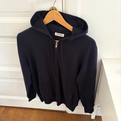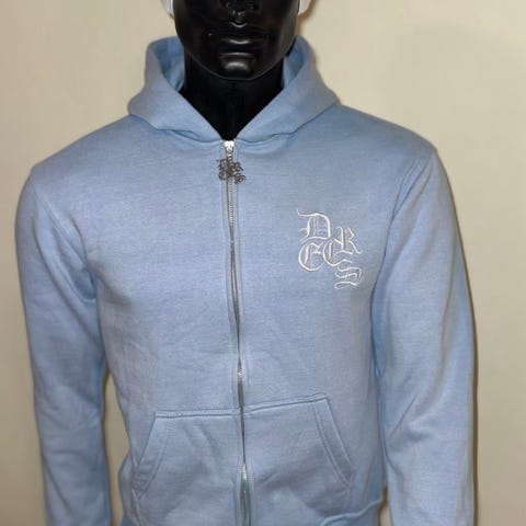 Vit och mörkblå hoodie med långa ärmar och en huva. Hoodien har en marmorerad effekt på framsidan och baksidan. Det finns en liten logotyp på bröstet.