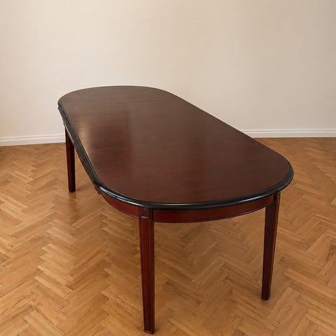 Matbord i massivt trä med symaskinsunderrede i gjutjärn & Fameg stolar