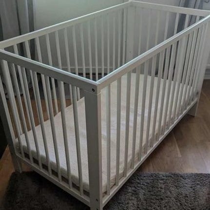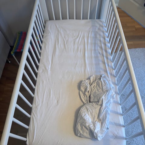 Sängen är i gott skick. Höjden kan enkelt justeras för de mindre barnen som inte kan ställa sig upp.