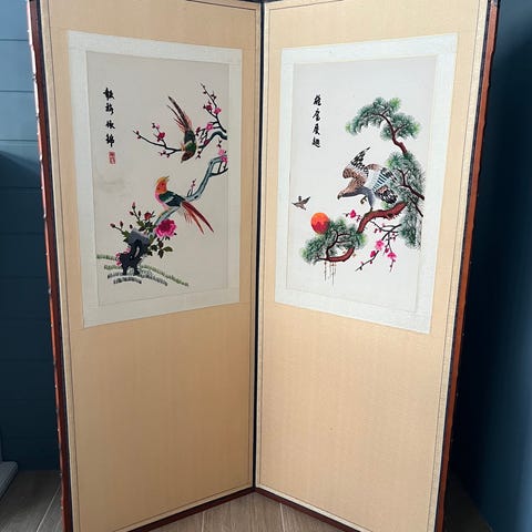 Brasskärm i ek, med siden textil, i oval ram. Höjd 122 cm. bredd 87 cm. Lite slitage på textil. Omkring 1900. Transport till centrala Sthlm. möjlig efter överenskommelse. + 400kr.