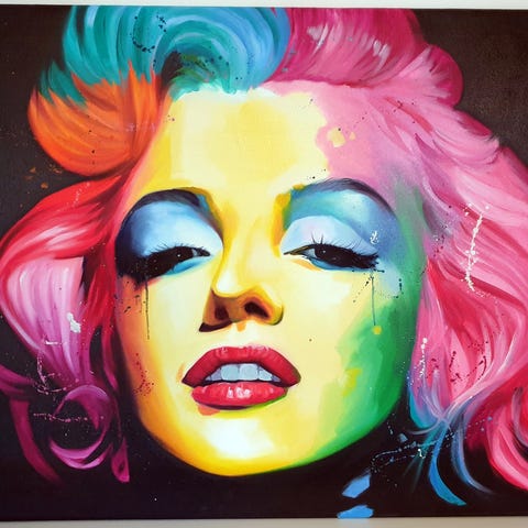 Färgglad abstrakt porträttmålning på duk med kraftiga färgtoner i orange, rött, gult och blått.