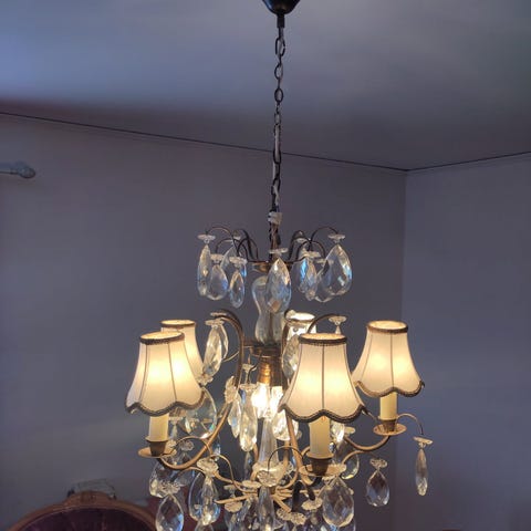 En vacker kristallkrona i en klassisk design - med 5 armar, beige lampskärmar och med äkta kristallprismor, några av dem är tonade. Kronan är i bra och fungerande skick, alla ljuskällor funkar och alla kristallprismor är på plats och i fint skick. Perfekt för att skapa en elegant och romantisk atmosfär i ditt hem.