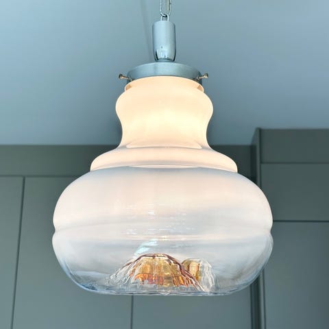 Köpt av: Palermo Atelier som handplockar sitt möbelsortiment, bland annat lampor på Sicilien. Påkostade en restaurering av lampan - som nu har godkänd eldragning. Takkrona i Muranoglas, tillskriven Toni Zuccheri för Mazzega, från 1970-talet. Vintage, i mycket bra skick!