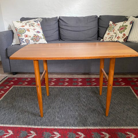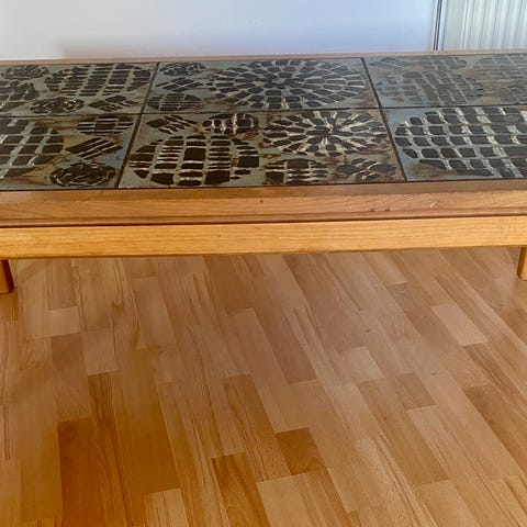 Cool modell med typiskt utställda ben och tidnings hylla. Kakeldekor målad av den i sammanhanget kände Edmund Pedersen.
