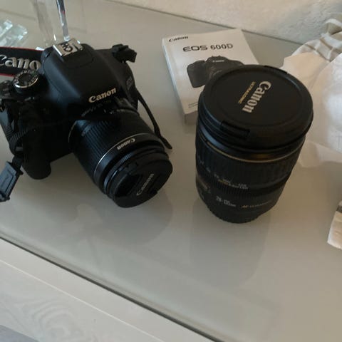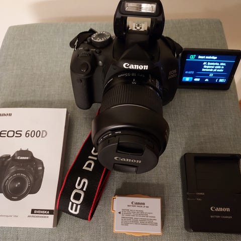 Canon EOS 600D är en digital systemkamera från Canon. Kameran levereras med två objektiv, blixt, batterier och tillbehörsväska. Passar för fotografering i olika miljöer och situationer.