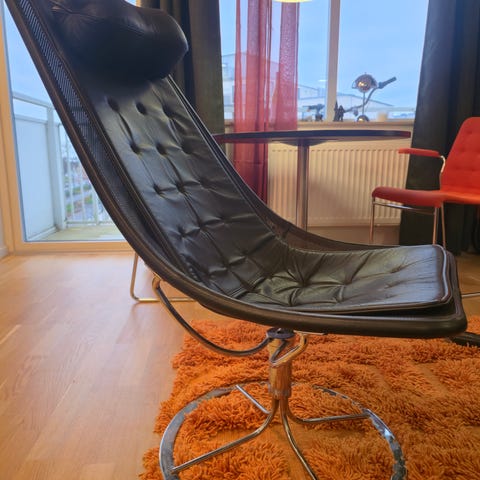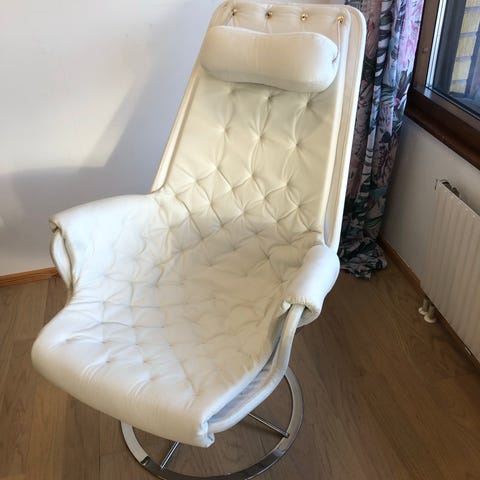 Ett par fåtöljer ”Karin” design Bruno Mathsson för Dux. Helt i original. Grått italienskt kalvskinn med patina slitning samt några sprickor och fläck. Inköpta ca 1979-80 i Stockholm på NK.