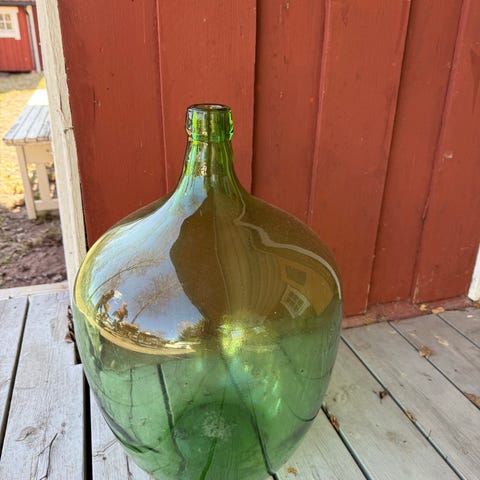 Stor konjaksfärgad damejeanne. Höjd 70 cm. Omkrets 174cm. Tror den är på 50 L minst.