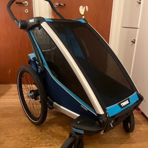 Thule sport 2, en helt fantastisk vagn! Inköpt år 2020. Använd men I fint skick! Finns ett mindre hål på väskan bak på vagnen, se bild.