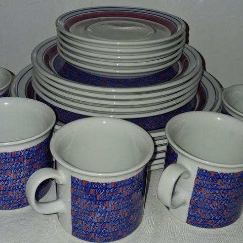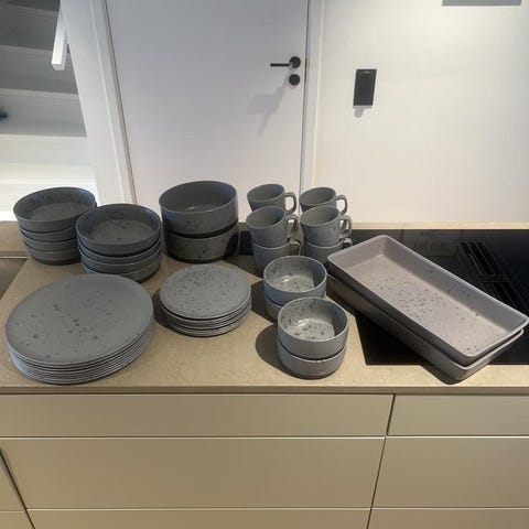 Jag säljer 4 stycken 37 cm tallrikar, 4 stycken assietter21 cm och 4 stycken skålar - märke Bitz Gastro. De är mörkblå till färgen och aldrig använda.