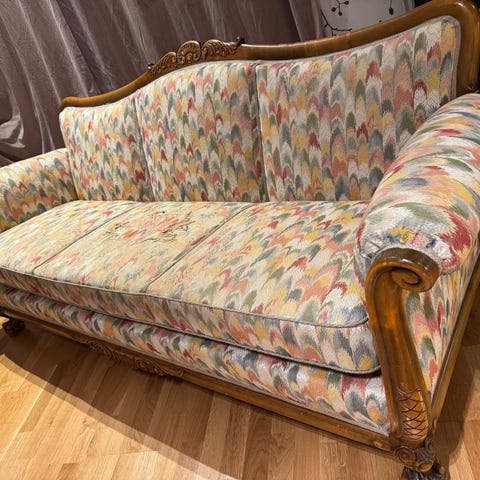 Soffa, antik, rosafärgad, bredd 135 cm, höjd 91 cm. Renoverad 1992. Fast” pris. Finns på Lidingö