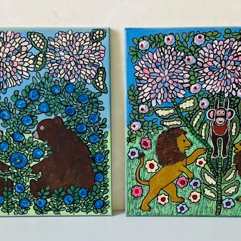 2 nymålade och ovanliga tavlor som du kan bli ensam om att ev äga. Format 50 x 40 cm/st. Målade med akryl på canvasduk. (Alla mina tavlor har målade kanter). Pris 350:-/st.