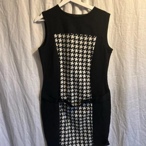 Snygg och välsydd klänning från Karen Millen i svartvitt mönster. Figursmickrande modell med kontrasterande paneler som framhäver midjan. Perfekt till fest, middag eller jobb.