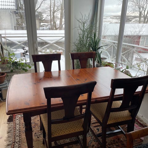 Matsalsbord i massiv ek säljes komplett med 6 stolar. Finns en iläggsskiva så man kan förlänga bordet. Djur och rökfri hem.