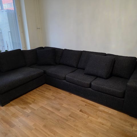 Vit hörnsoffa i tyg med plats för flera personer. Passar för vardagsrum eller loungeytor. Soffan har en modern design och ljus färg som kan komplettera olika inredningsstilar.