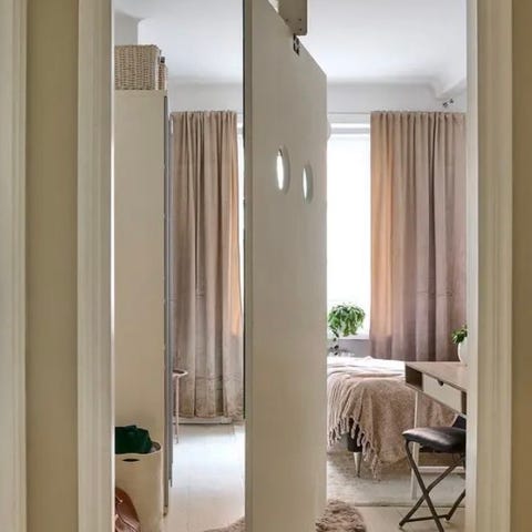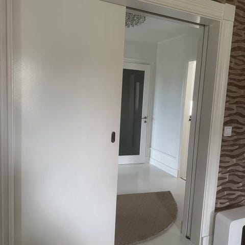 Skjutdörr med spegel. Baksidan är i ek Mått: h204cm x b87cm Använd som vanlig golvstående spegel eller som skjutdörr. Medföljer handtag, skena och täcklist. Saknas skjutdörrsrullar. Finns att köpa på Jula för 199kr. Nypris 3500kr Säljes för 350kr