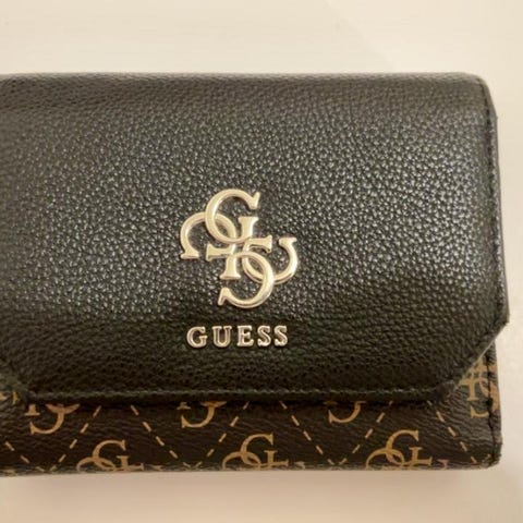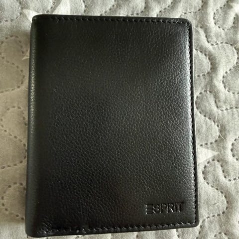 svart plånbok från ”Esprit” med jätte fint blå, röd och vit mönster inuti, material: konstläder, myntfack med dragkedja, fack med dragkedja på utsidan, 12 kort får plats, 2 fack för kontanter, bra skick,