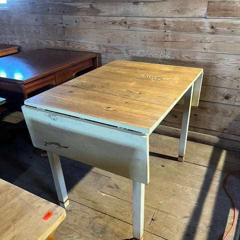 Trevligt 1800-tal slagbord med låda. Grå/vit målade ben, skivan träfärgad. Två klaffar. 2x70 cm. 53 cm med klaffarna nerfällda total längd med uppfällda klaffar = 193 cm. Bredd 93,5. Höjd 74 cm