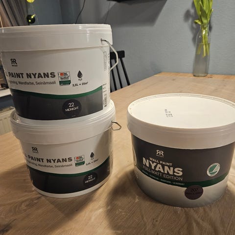 Alcro (Diamant 500kr dyrare/burk+ pigmentering 250kr/burk) ljusgul husfasad färg heltäckande. Köptes för en vecka sedan/felköp. Räcker till 250-300 kvm.
