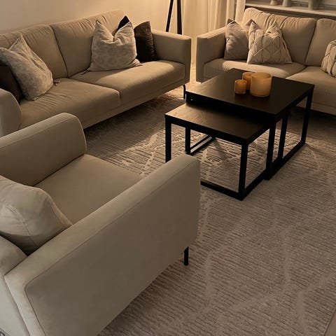 Sofforna är nästan ett år gamla (maj) och i mycket fint skick. Vi har till och med haft filtar över sittdynorna så aldrig suttit direkt i soffan. Tar emot att sälja! Fin naturvit färg.