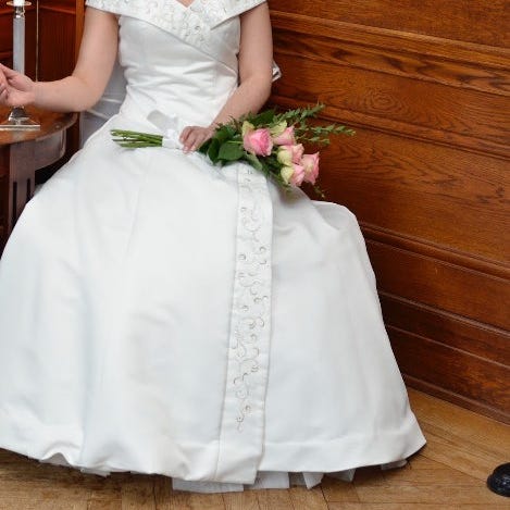 Mycket vacker stilren bröllopsklänning för vinterbröllop eller för att ändra utifrån önskemål. Vacker tyg som har lite struktur, osäker på vilken typ. Fin liten väska till. Design Bonita of London.