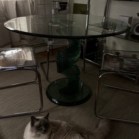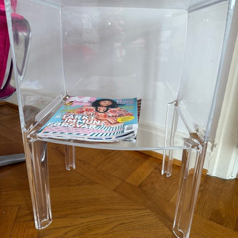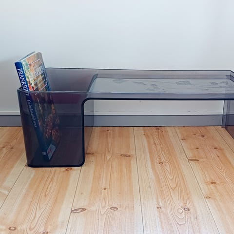 Ett sidobord/soffbord med funktion. Bordet har ett lock som går att lyfta och helt plötsligt har man en förvaring för tidningar, fjärrkontroller, stickningen m.m. designad för Kartell av Bröderna Bouroullec. Bordet är i plast och har naturligtvis smärre repor.