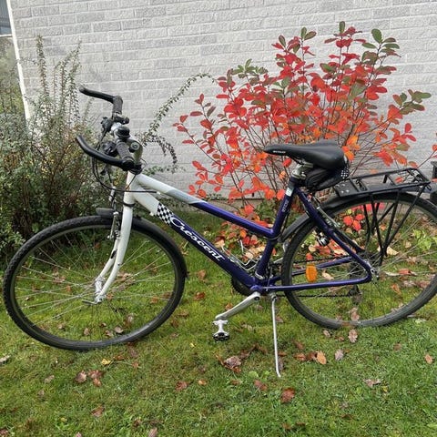 Blå damcykel från Crescent. Överlag bra skick, bra däck och hela slangar och bromsar och växlar funkar. Saknas någon eker på bakhjulet, men det funkar bra ändå!