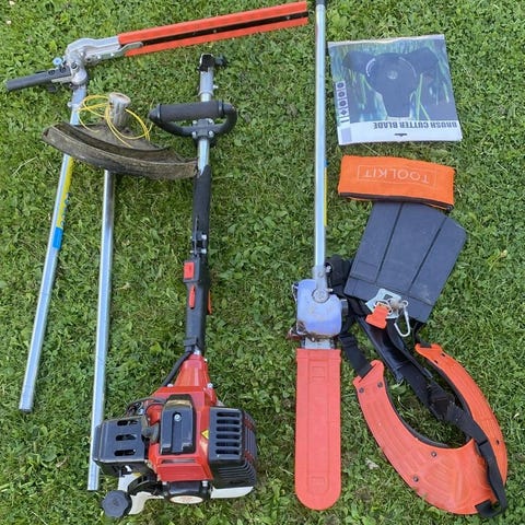 Trimmerspolen har 450 mm arbetsbredd, halvautomatisk trådmatning och rymmer 2,8 mm x 4 m trimmertråd. Slyklingan är tretandad och har 255 mm arbetsbredd.