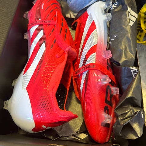 Adidas Predator fotbollsskor 2025 modellen (ordinarie pris 2900kr) som endast har använts 1-2 gånger. Det är storlek 41 1/2 och är i utmärkt skick. Dvs. inga skador eller tungt slitage på skorna.