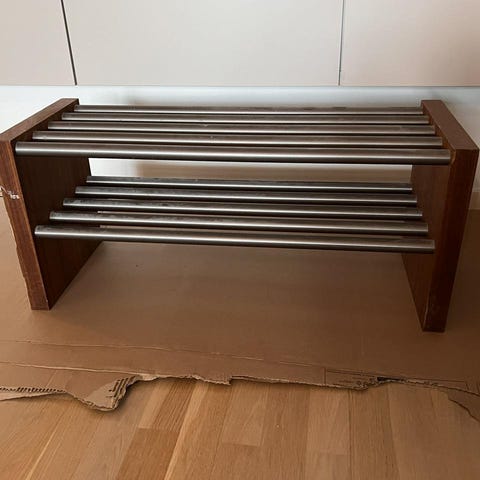 Målad ljusgrå. Gedigen i trä, tung.