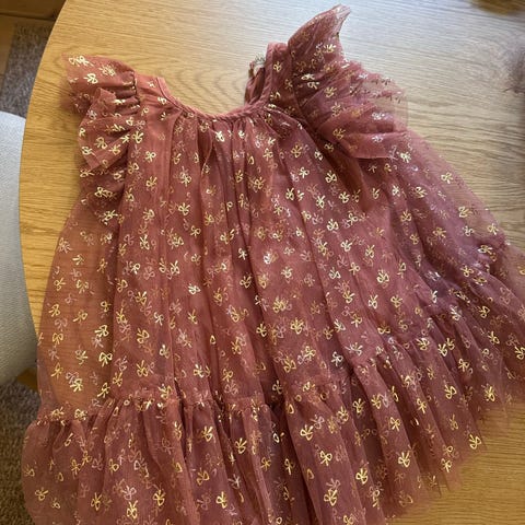 Två rosa/guld princessklänningar. Köpta i England och har kalasats i så har spår av det (svaga fläckar som inte stör). Puffärm. 150kr för båda.