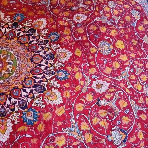 Jag säljer en välbevarad antik handknuten Tekke, s.k. Boukhara. Formatet är nästan kvadratiskt: 164 x 147 cm – ovanlig och därför eftertraktad storlek att ha som väggtextil. Sannolikt vävd sent 1800-tal/sekelskiftet 1900. Klassisk tekke: Rikt rödbetonat fält, täckt av upprepade gül-motiv, handspunnen ull på ullvarp. Knytning: cirka 5x5 knutar per cm, motsvarande 250 000 knutar per kvadratmeter. Mattan är i gott skick med vacker patina. Det finns en mindre skada i kanten (ca 4 cm i en av sidornas avslutande söm), men inga hål eller tunnslitna partier. Mattan har två mindre reparationer som sig bör, professionellt utförda (se detaljbilder). På två av sidorna finns de typiska vävda sidobårderna, medan de andra två har kvar sina ursprungliga kortare fransar. Mattan är helt plan, rak och luktfri. Har förvarats i rök- och djurfritt hem. Inköpt hos JP Willborg. Säljer den här för att både köpare och säljare ska slippa aktionshusens avgifter. Hör av er vid frågor.
