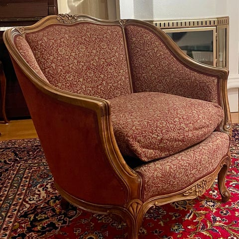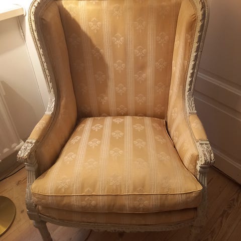 SÄLJES PGA PLATSBRIST/FLYTT. DEN HAR STÅTT UNDANSTÄLLD OCH ÄR I MRCKET GOTT SKICK. RÖK-och DJURFRI MILJÖ. DEN ÄR OMSTOPPAD OCH OMTAPETSERAD, SE KVITTO, KOSTNAD 4000 kr. TYGET EJ MEDRÄKNAT, KOSTNAD CA 1000 kr. MYCKET PASSANDE I HERRGÅRDSMILJÖ ELLER ÄLDRE VÅNING. Sitthöjd 47 cm, sittdjup 53 cm, höjd rygg ca 65 cm.