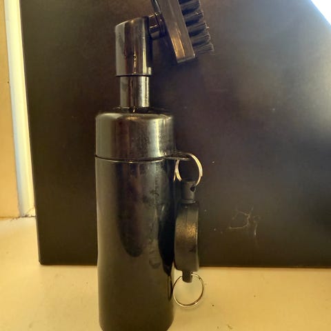 En borste som innehåller vatten till för att tvätta sina golfklubbor på ett snabbt och effektivt sätt, hänger på bagen och har en snygg grön design