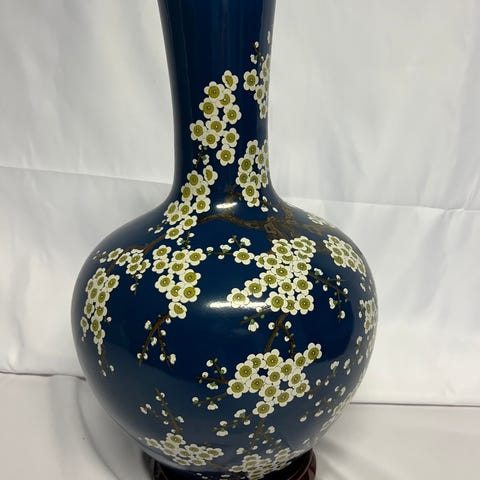 Oidentifierad antik dekorativ vas i guldfärgat material med detaljerade utsmyckningar och ornament. Vasens design inkluderar figurer och bladmönster, placerad på en svart bas. Passar som samlarobjekt eller inredningsdetalj.
