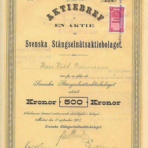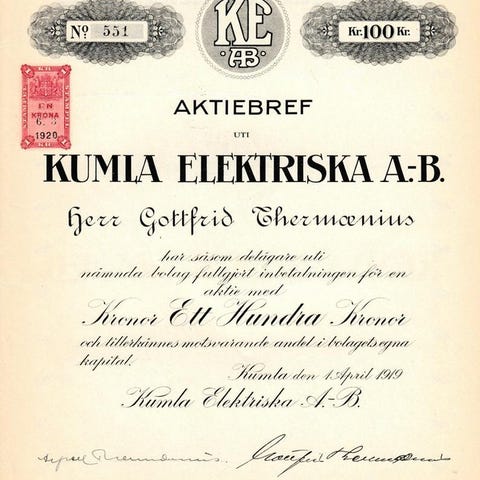 Aktiebrev å nom. 500 kr utställt på Fru Sonja Pettersson.